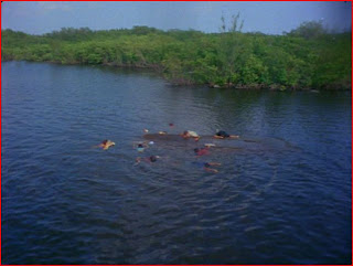 It's important to remember one's gloves when tooling around in the Everglades....The group all sit down for some refreshing orangeade and introductions....we learn that the bathing beauty was probably a woman named Ruth who is another important member of the team studying sea life....but apparently not all that important as I've already stated....