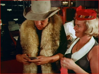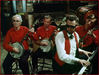 Gotta love a man who knows when to hold 'em and when to fold 'em. Anyway, you think our plucky hero is about to leave the bar and go his happy way, when a bunch of partiers at the bar stop him and tell him he needs a drink. Then five seconds later the leader of the bunch, promises him 'banjo dust and starry eyed broads lookin for a good time' if they all go party somewhere. He also announces that his name is 'Elbow Johnson'. Everyone, including Grandma, thinks this is a swell idea. So, one creepy closeup later, they're on their way....